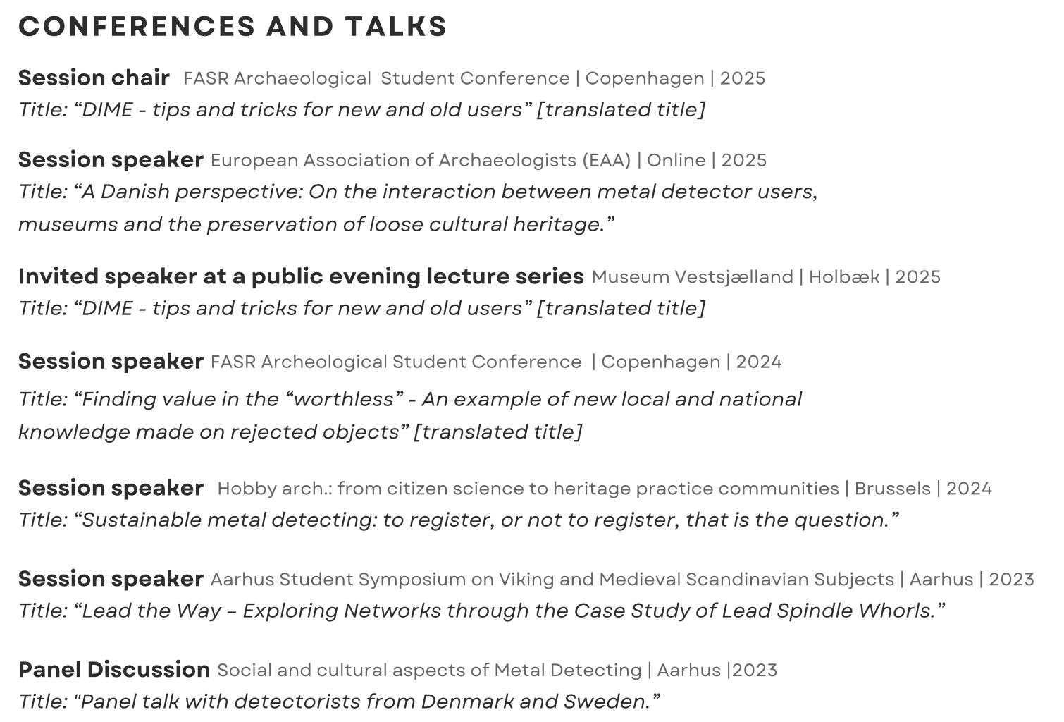 Jeg er arkæolog med særligt fokus på metaldetektering, registreringspraksis og samarbejdet mellem museer og frivillige. Mit arbejde kredser om, hvordan valg i dokumentation og udvælgelse former den arkæologiske viden, vi producerer, og hvordan kulturarv kan forvaltes og formidles mere bæredygtigt og inkluderende.